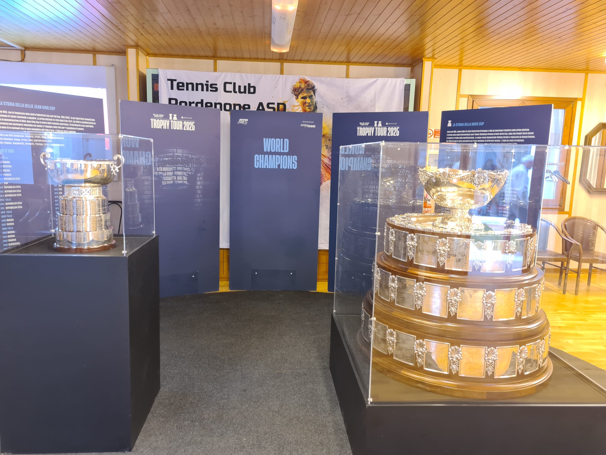 Two of the most prestigious trophies in international tennis made a stop in northeastern Italy today as part of the nationwide “Trophy Tour,” celebrating an unprecedented moment in the country’s sports history. The Davis Cup and the Billie Jean King Cup, representing Italy’s 2024 victories in both men’s and women’s international team tennis, were on display at the Tennis Club Pordenone.