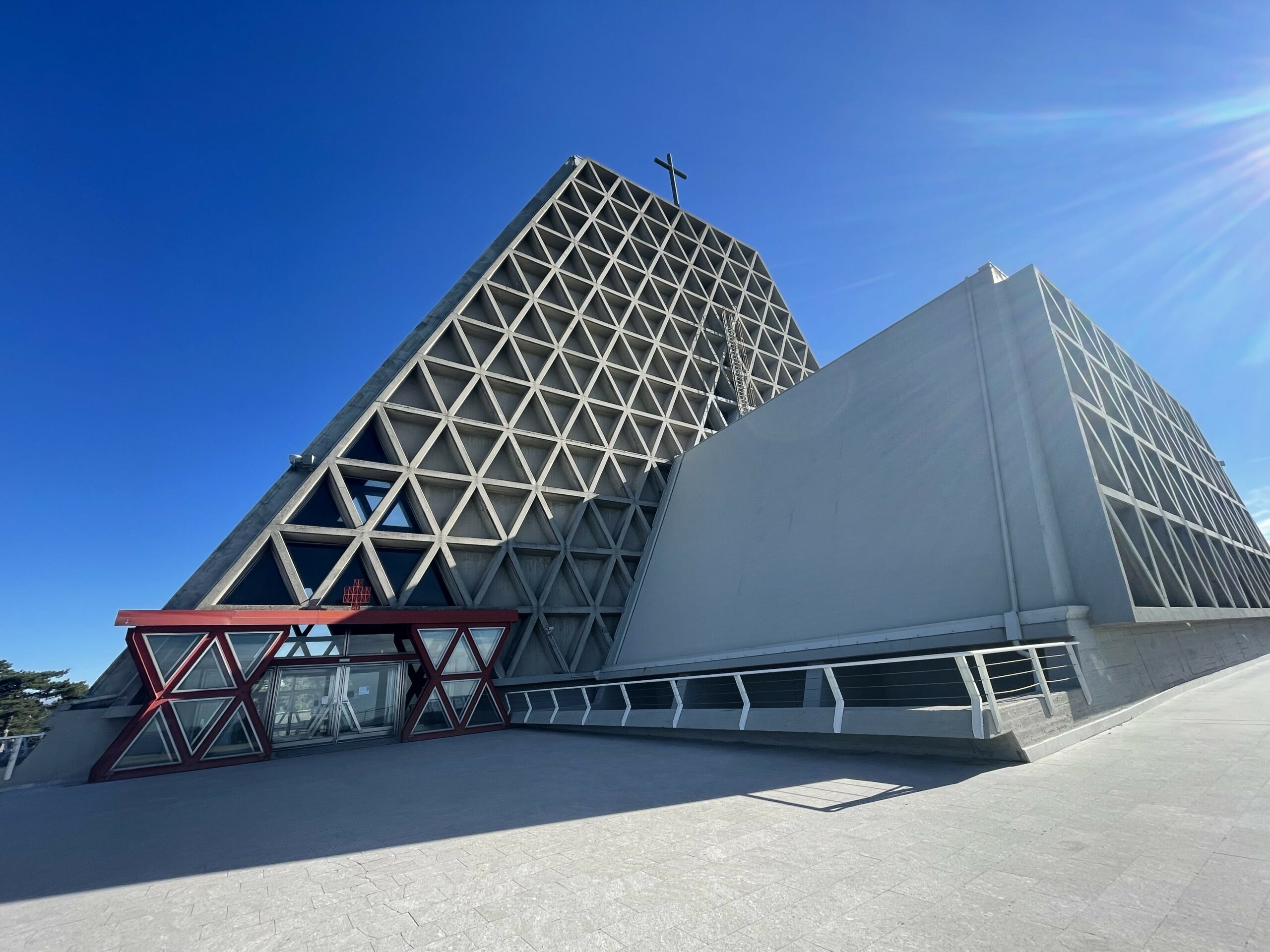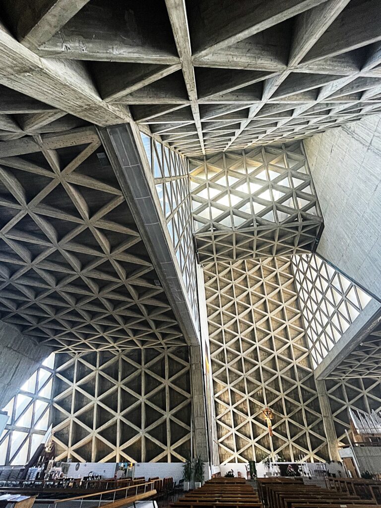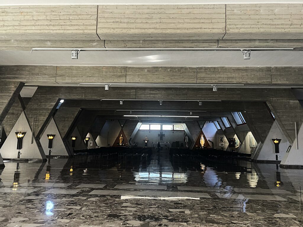 Inside, the sanctuary contains two churches, one above the other, with light filtering dramatically through its concrete ribs. Pilgrims visit to pray before the Madonna, but even those without a religious motive are struck by the play of shadows and light, the vastness of space, the solemn atmosphere. For many, the experience is both stark and moving — an encounter with a form of sacred architecture that breaks decisively with tradition.