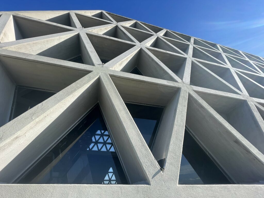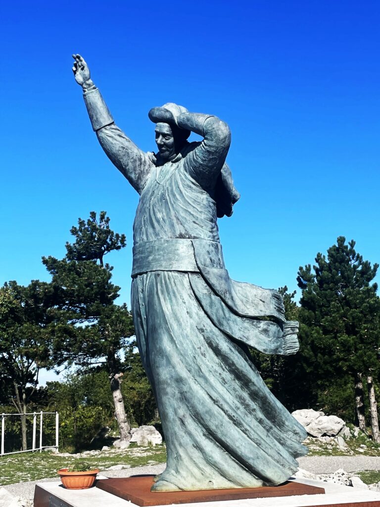 Monte Grisa was designed by Antonio Guacci, working from Bishop Santin’s sketches, and its geometry is unmistakable. Constructed almost entirely of reinforced concrete, the sanctuary is made up of triangular modules that evoke the letter M, a reference to Mary. This triangular motif dominates its facades, creating an angular, futuristic silhouette that contrasts sharply with the wooded slopes of the Carso. For the faithful, it is a symbol of protection and reconciliation. For architecture enthusiasts, it is a bold expression of post-war modernism. And for many Triestini, who view it from the city below, it is affectionately and somewhat irreverently called the formaggino — because its triangular structure resembles the soft, foil-wrapped cheese wedges given to children. The statue of Monsignor Santin today stands in perpetual struggle against the Bora, which at the most panoramic point of the site exceeds 100 km/h on particularly windy days.