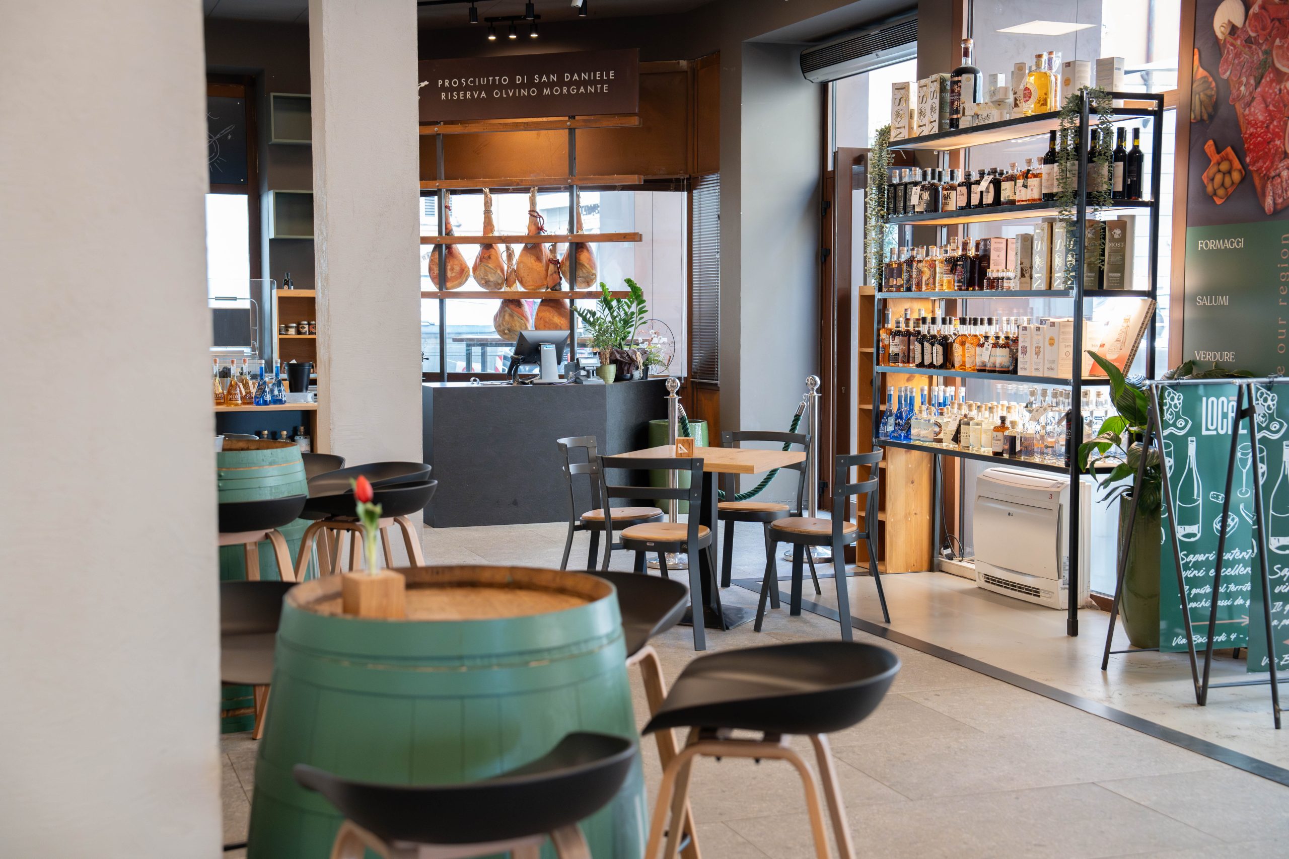 Step inside and everything echoes the region’s earthy palette. Warm greens and browns, wide spaces, long cushioned seats, and modern furnishings create an environment that feels both designed and lived-in. A scenographic green counter greets guests at the entrance, while the eye wanders to the wine barrels, the circular table dedicated to the “vecchie matasse,” and a refrigerated counter brimming with local delicacies.